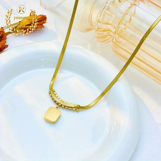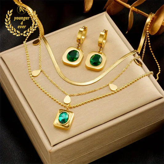 Set of stainless steel jewelry green square necklace hand jewelry earrings three