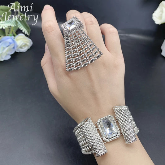 Retro Gemstone Necklace Earrings Bracelet Ring Rhinestone Silver Plated Jewelry Set for Women African Bridal Wedding Party Gifts (143)
