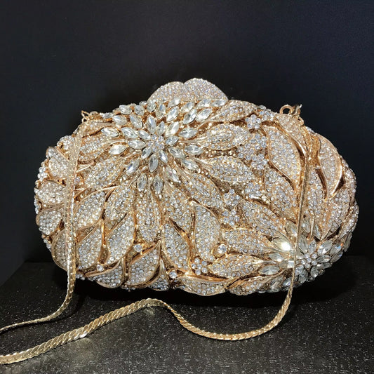 Gold Metal Leaves White Crystals Evening Clutch Bags Luxury Women Wedding Party Purse Ball Handbags Rhinestone Mini Minaudiere (070)