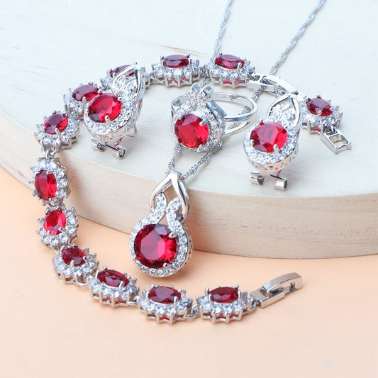 Ladies 925 Silver Jewelry Sets Red Zircon Earrings for Women Rings Wedding Jewelry Pendant Bridal Necklace Stones Bracelets Set (023)