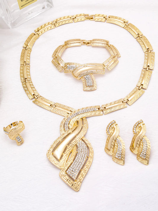 HY Gold-Plated Zirconia 4-Piece Bridal Necklace, Earrings, Bracelet, Ring, Ultra-Fashionable Libyan Dubai Bridal Jewelry Set (091)