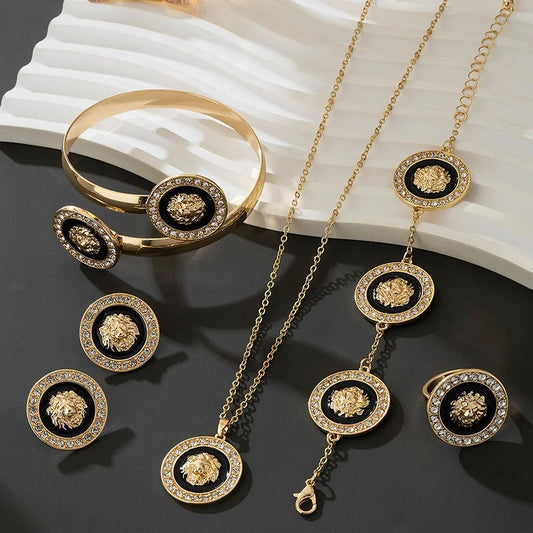5Pcs/Set Gold-Plated Lion Head Party Jewelry Set for Women Crystal Pendant Necklace Bracelet Chains Bangles Earrings Ring (094)