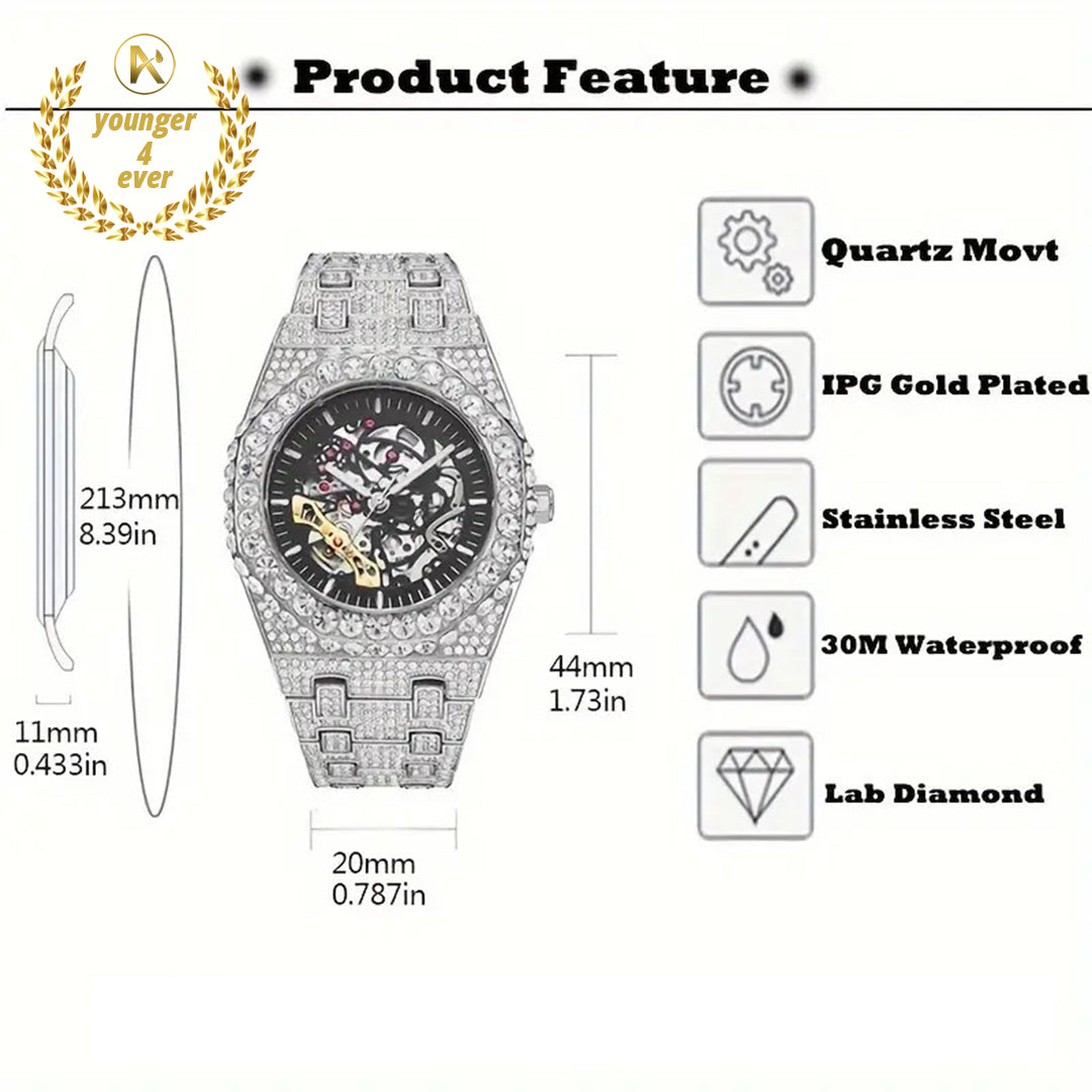 Luxurious MISSFOX Hip-Hop Brand Men's Golden Watch - Automatic Mechanical Movement, Stainless Steel, All Ice Rhinestone Jewelry, Fashionable New Style, Water Resistant, Scratch Proof, Perfect for Formal Occasions and Daily Wear