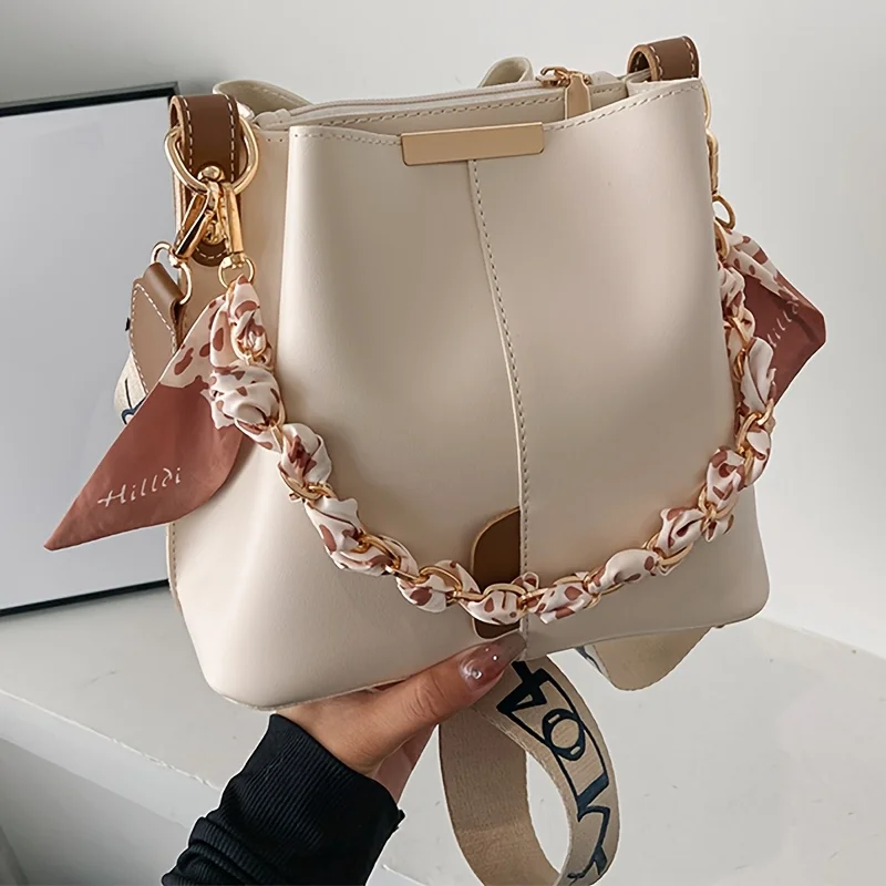 New Fashion Women'S Shoulder Bag Large Capacity Ribbon Chain Bucket Bag Crossbody Bag Daily Commuting (007)